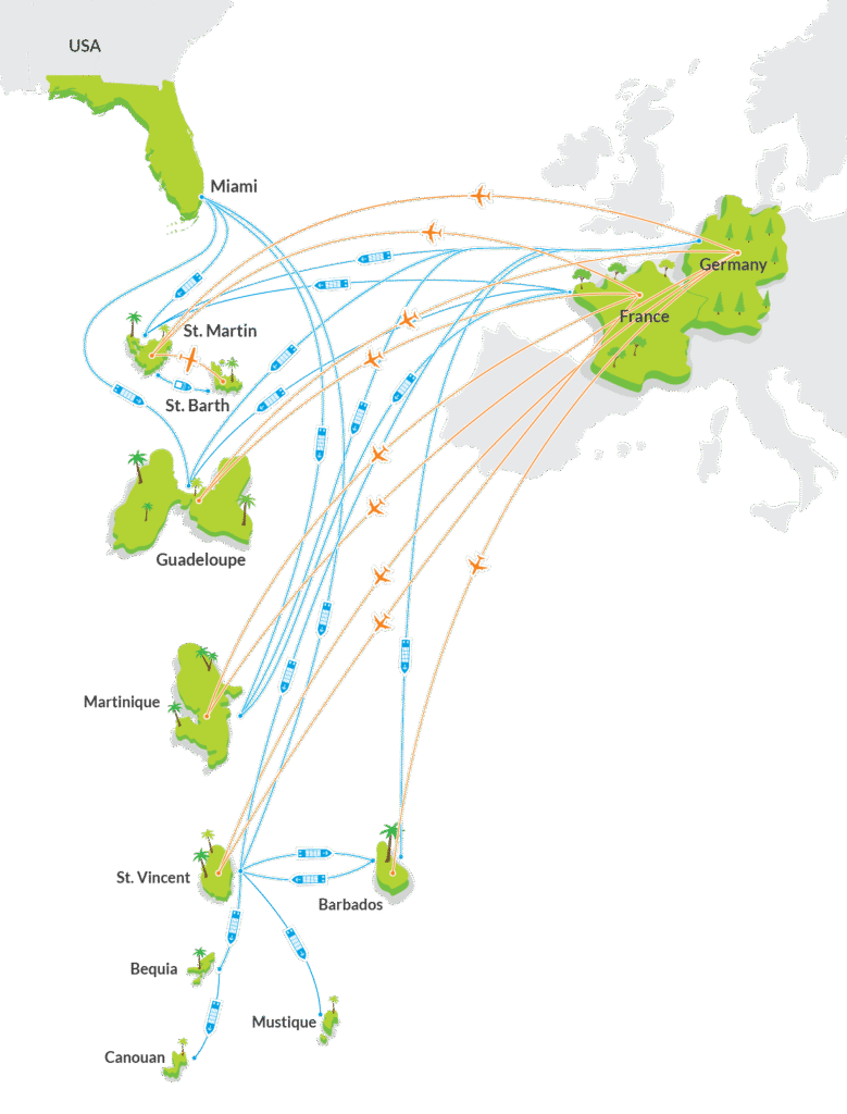 Major international shipping partners, regional carriers and own air and sea transport, equipped with full cooling capacity for fast, reliable, and fresh deliveries across the Caribbean.